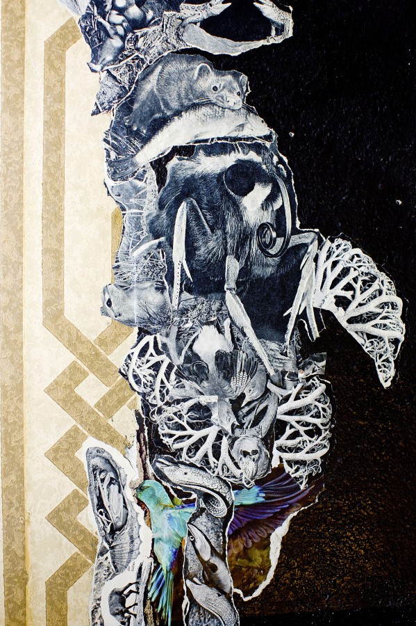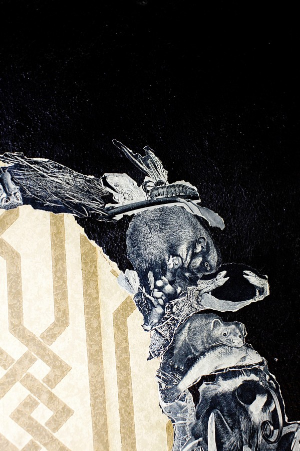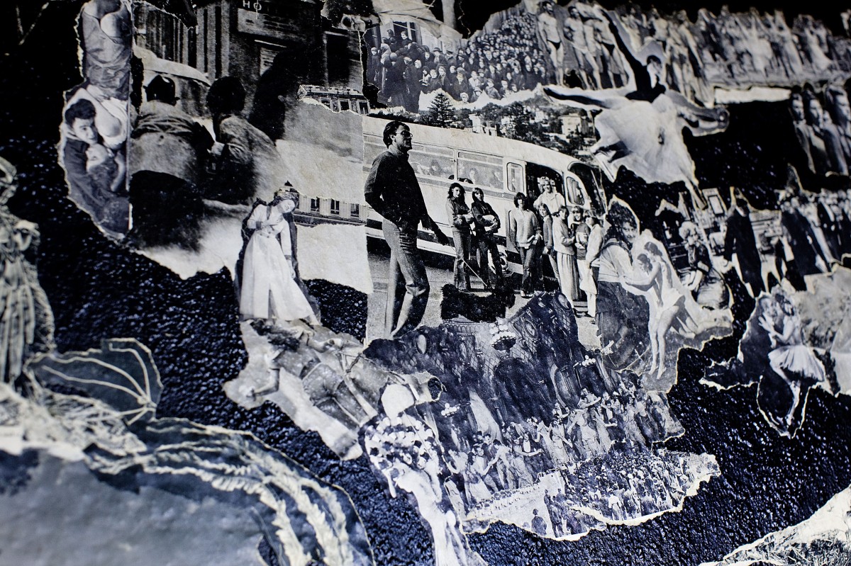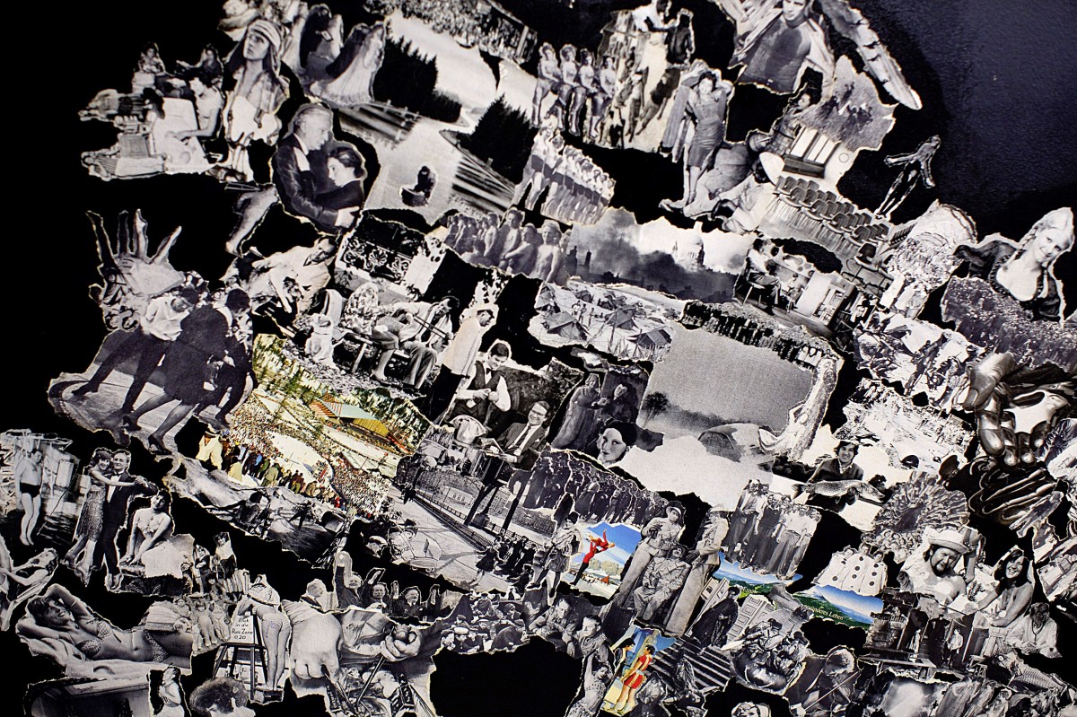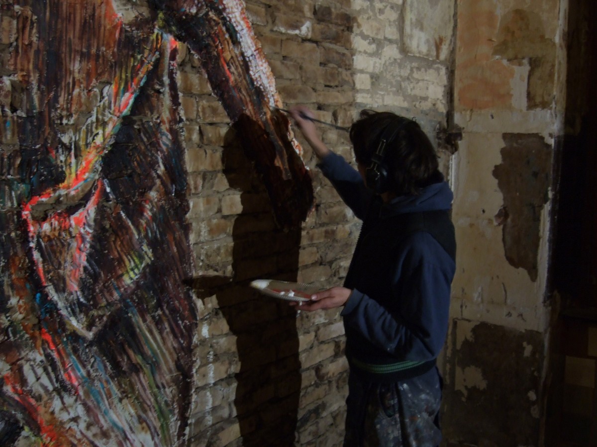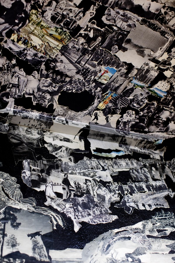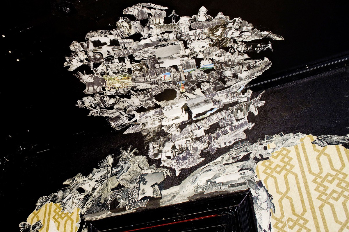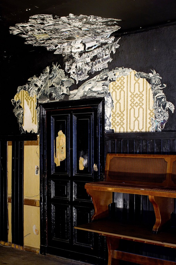 »helden und schurken« ausrisse aus 2 büchern auf tapete gekleistert 2008die menschenausschnitt»o.T.« putz (rotband) gespachteltacryl, öl/mauer 295cm x 229cm 2008gesamte wand: 330 cm x 556 cm